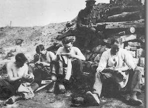 The unknown soldiers in the picture are attempting to delouse their clothing. When not in the trenches, sometimes lighted cigarettes or candles would be used to burn the lice, but this could have unwelcome side effects, such as destroying the clothes. Body lice needed warm conditions and found them in the body heat and warm clothing of the soldiers, often huddled together to keep warm. As a result the lice moved easily from person to person. Lice reproduced quickly, with each female producing more than ten eggs per day.