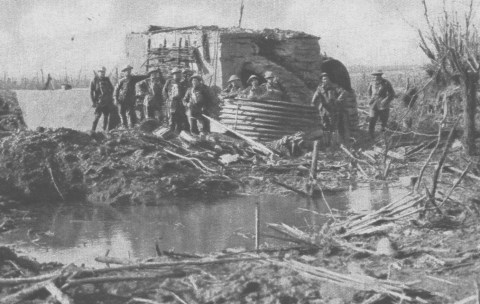 The enemy retaliated with a heavy barrage and machine gun fire, inflicting heavy casualties. The men moved slowly across the slime, around the brimming craters, over and through entanglements until they were forced to take cover in freshly made shell holes. In two hours they progressed only 500 yards. The task was entirely different from that of Vimy where the artillery had obliterated all opposition. Here the enemy had to be fought step by step across the open.”