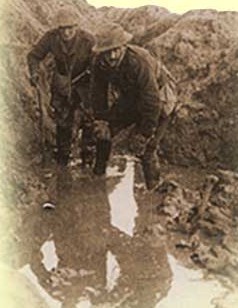 In a flooded trench, corpses of Germans, their stomachs grotesquely bloated, floated in slushy water. Here and there were bodies buried in the mud with only an arm or leg showing above the surface. Macabre faces appeared, blackened by their long stay on the ground. Everywhere I looked, all I could see was corpses covered in a shroud of mud.”