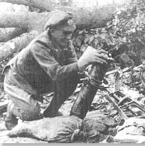 “D” Company was on the rAt zero hour, one hundred and eighty 18-pounders, sixty 4.5 Howitzers and about one hundred and twenty-five Heavies of various description opened up on the Divisional front. Trench mortars (right) concentrated on the barbed wire, which was not very formidable and on the pillboxes, which were almost immune. A gentle rain began to fall and the first of the assaulting troops went forward in a drizzle in the hazy dawn. In the confusion of battle, it was impossible to retain a definite formation and, as in other attacks, such regularity soon collapsed; the troops pushing forward as best they could. “C” Company under Lieutenant Nesbitt was on the left, with “B” Company seventy yards behind. ight with “A” Company behind. Machine gunners followed and, in fifteen minutes, the second wave started.