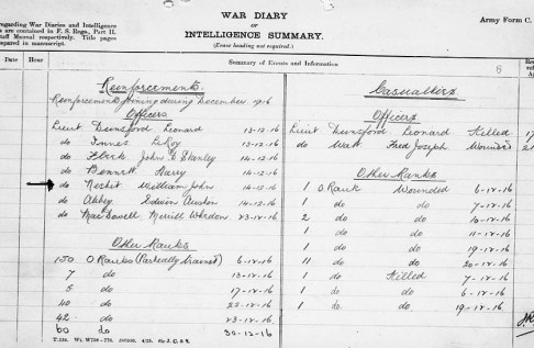 November saw five Lieutenants and 207 Other Ranks taken on strength and in December 1916 they added seven Lieutenants, including Bill Nesbitt (see black arrow), 150 partially trained troops and 154 others.