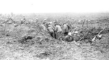 “As the infantry moved forward (below) between the shell holes filled with icy water, they began to come under heavy machine gun and rifle fire, which caused many casualties. At the start, the ground was in such appalling state that the troops could not keep up with the barrage, groping along because of the storm. Hour after hour Germans and Canadians fought on, often hand to hand.”