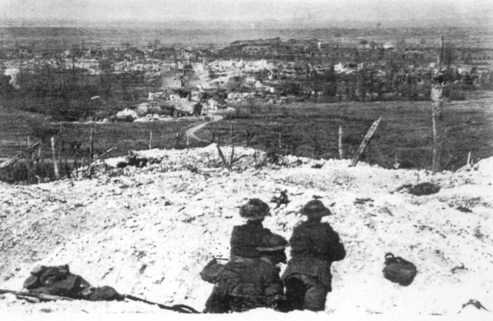 “To get a view of the Douai Plain, it was only necessary to go forward a few hundred yards to the crest (below). We could see the disordered columns of the retreating Germans. With imagination we could visualize German troops with eyes turned towards their ‘ impregnable’ fortress, scarcely believing it to be occupied by the enemy.”