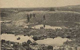 “The men saw for the first time on either side of the road the devastation of the Somme battlefields. Not a tree was standing; La Boiselle was a heap of rubble and the remains of its buildings had been used to fill the shell holes in the road. Shell cases were strewn along the roadside or marked old battery positions. Tangled wire (along with mine holes and craters – below) and mutilated trenches covered the barren waste as far as the eye could see.”