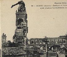 “At Albert we were all very interested to see the figure of the Madonna and Child leaning at right angles from the spire across the street (right in 1916 and below left as seen today). We were shown an open space known as the ‘Brickworks’, a spot in which we were to spend the night, managing to secure a few ‘Bivvies’ to protect us from the weather. As these ‘Bivvies’ held about twelve men and were open at both ends and as the weather at this time was very wet and cold, it can be imagined that not much sleep was obtained.”
